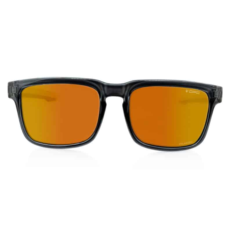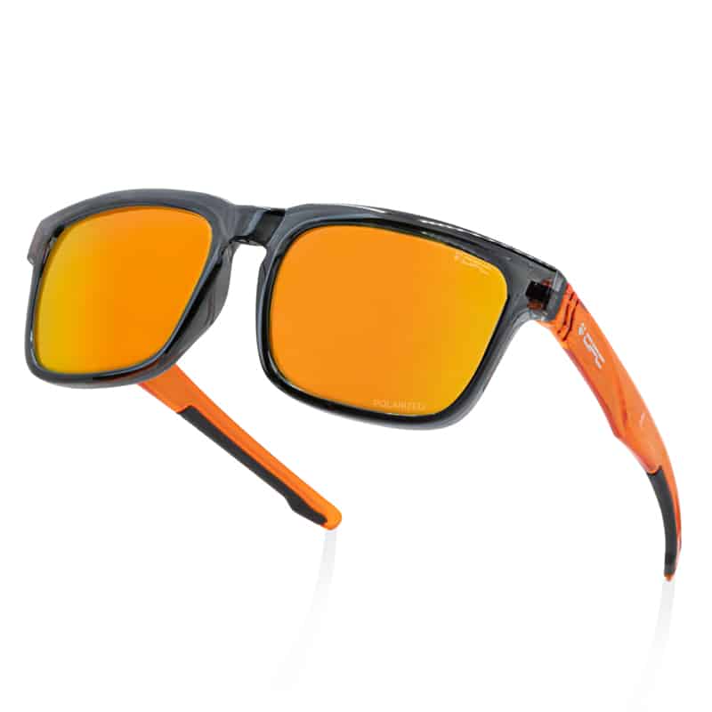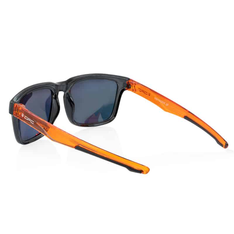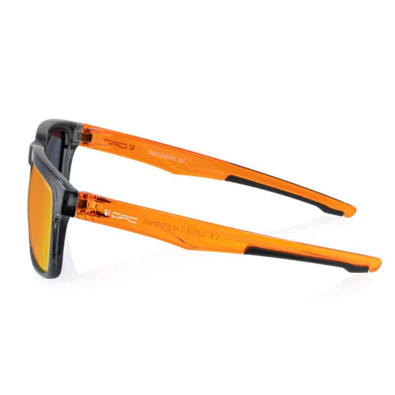 Model okularów przeciwsłonecznych obok których nie sposób przejść obojętnie. Wisienką na tym „okularowym” torcie jest pomarańczowo-czarna oprawka zbudowana z wysokiej jakości nylonu (niezwykle wytrzymały materiał TR90) oraz połyskujące wykończenie.